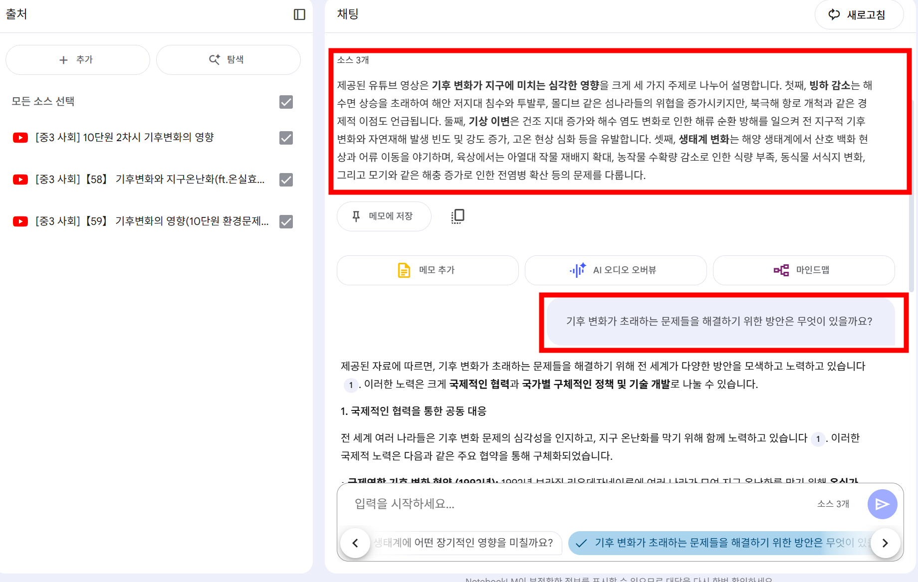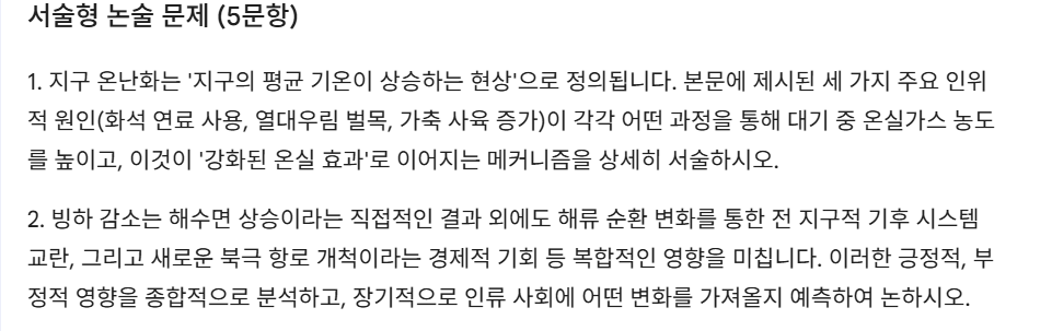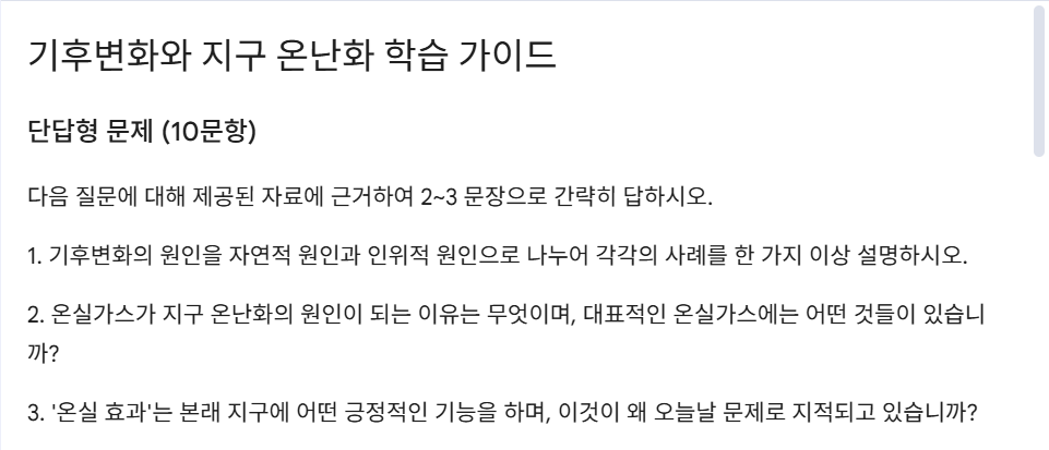 중등 사회의 ‘기후변화의 영향’처럼 방대한 주제를 다룰 때도, 단순 암기에서 끝나지 않고 핵심 정리 → 질문 → 사고 확장 → 발표 준비로 이어지는 학습 흐름을 설계할 수 있다는 점이 큰 강점입니다.