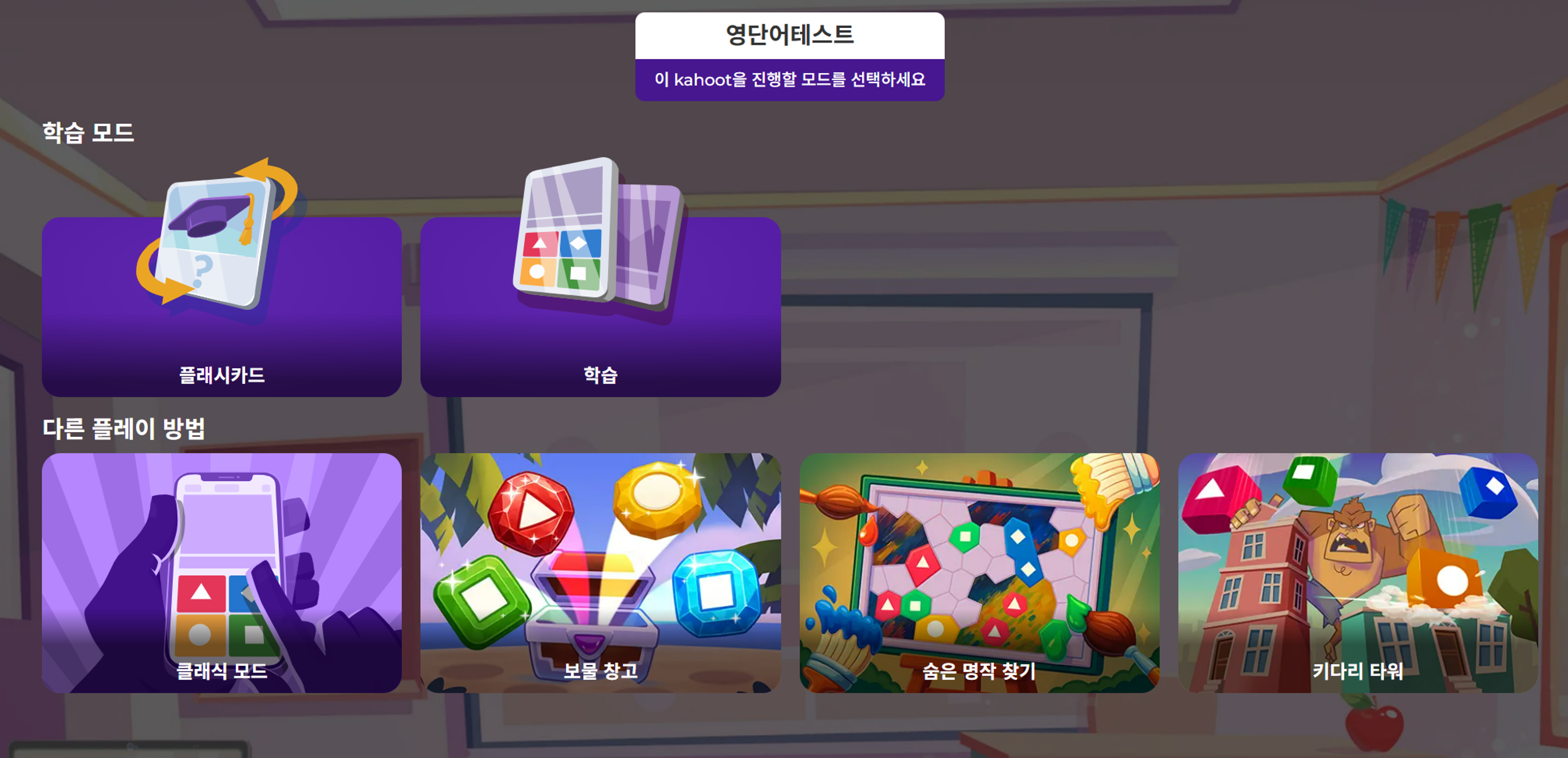 또한, Kahoot에는 플래시카드 모드가 있어서 퀴즈를 풀기 전 학습용으로 단어를 먼저 익히는 데도 활용할 수 있습니다.