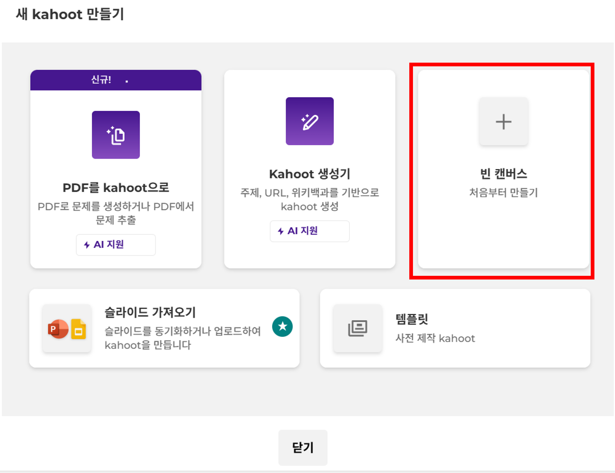 👉 경로: 생성 → Kahoot → 빈 캔버스 → 슬라이드 추가 → 스프레드시트 가져오기 (템플릿 업로드)