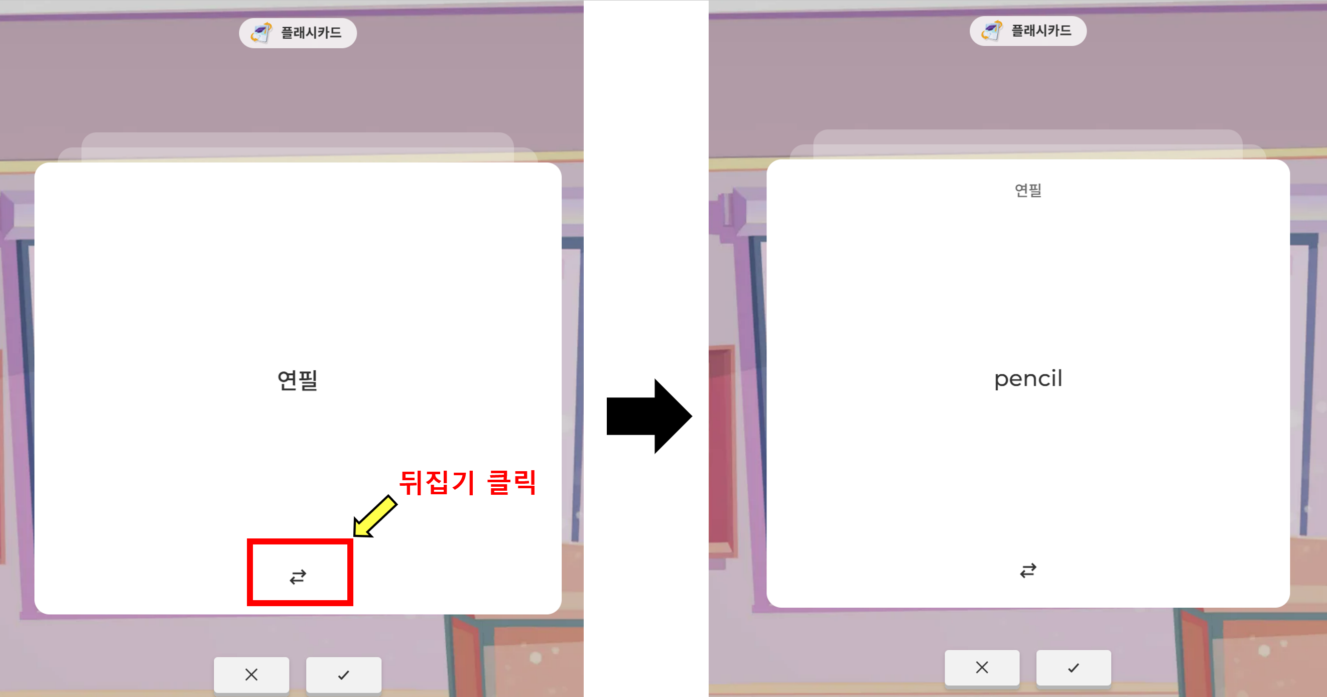 퀴즈 내용이 아직 학습이 되기 전 상태라면, "플래시 카드" 모드로 학습을 할 수도 있습니다. (카드 뒤집기)